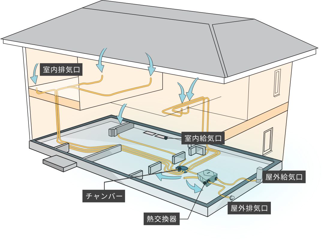 基礎の中から空気を家中に運ぶシステムで、各部屋がまんべんなく換気できる点が気に入っています。