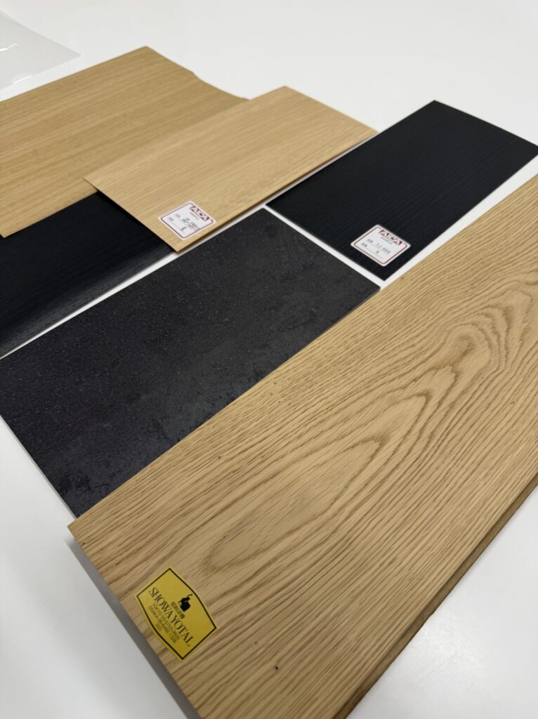 素材自体は黒にも白にもなじみの良い中間色を採用したかったので、樹種はオーク(ナラの木)に。