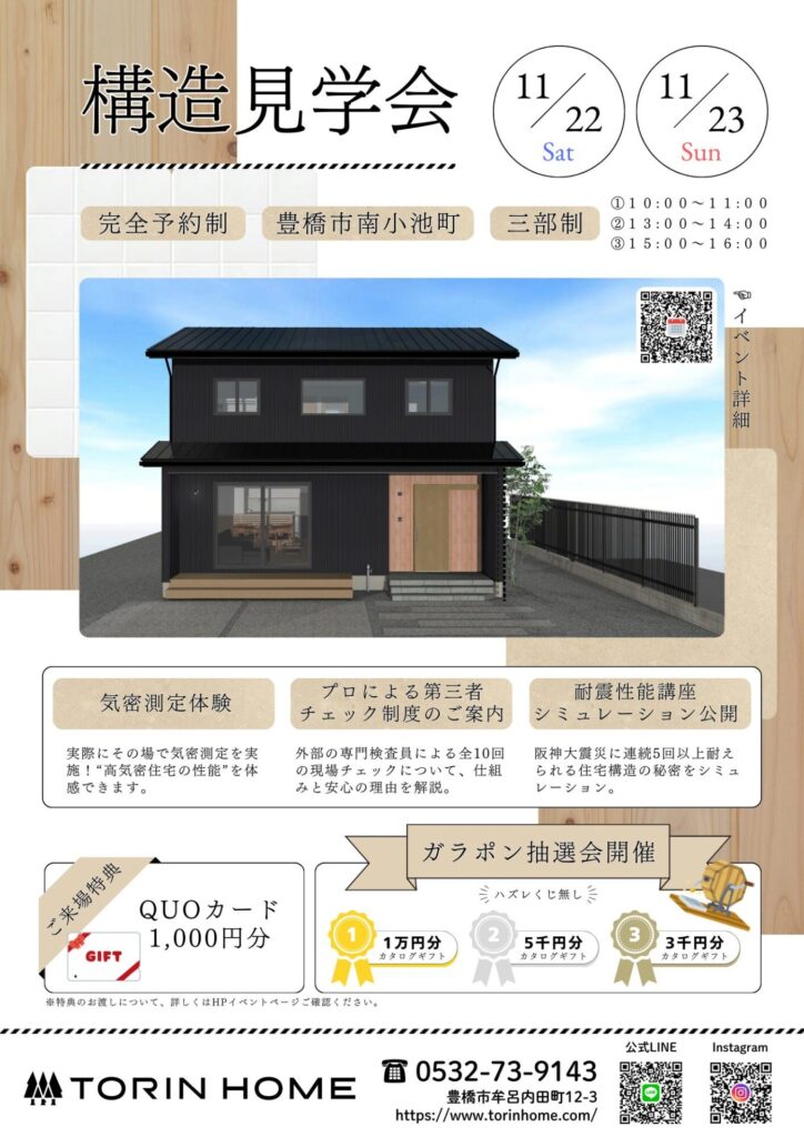 備考 ※特典は原則として、【完成見学会含む、トーリンホームに初来場の方】のみのお渡しとさせていただきます。一度でもご来場を頂いたお客様は営業担当へ直接ご連絡をお願いいたします。