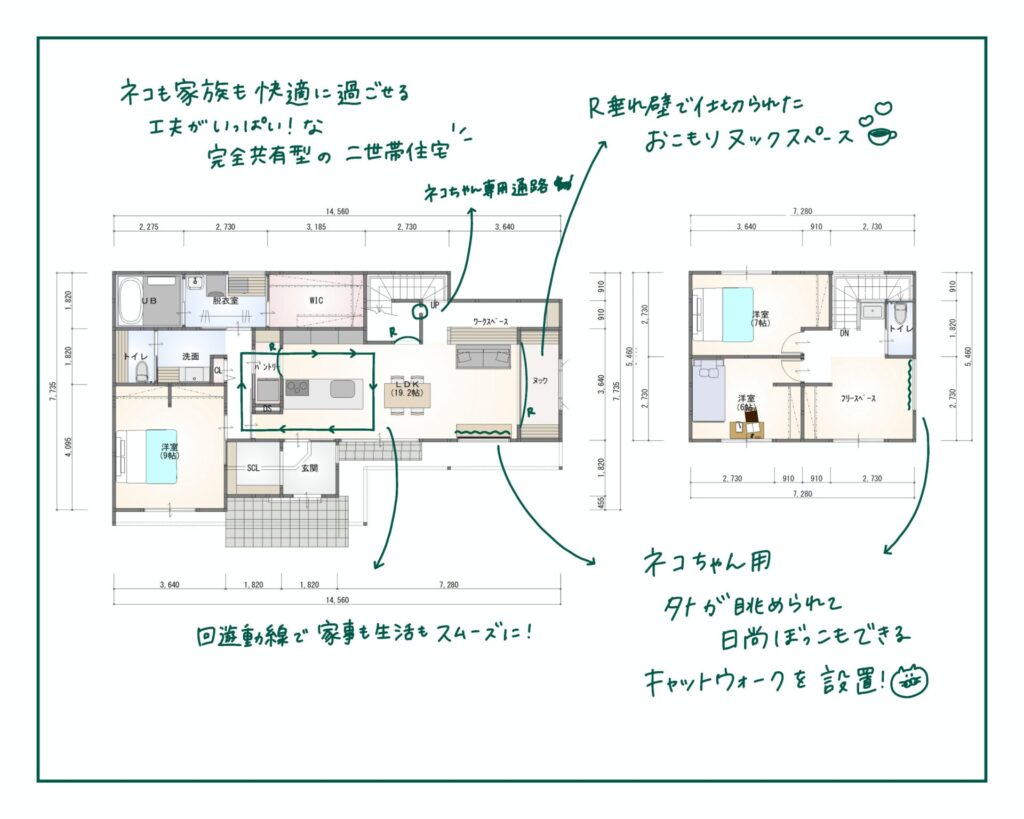 人とネコ、それぞれの動きを考えた完全共有型二世帯住宅