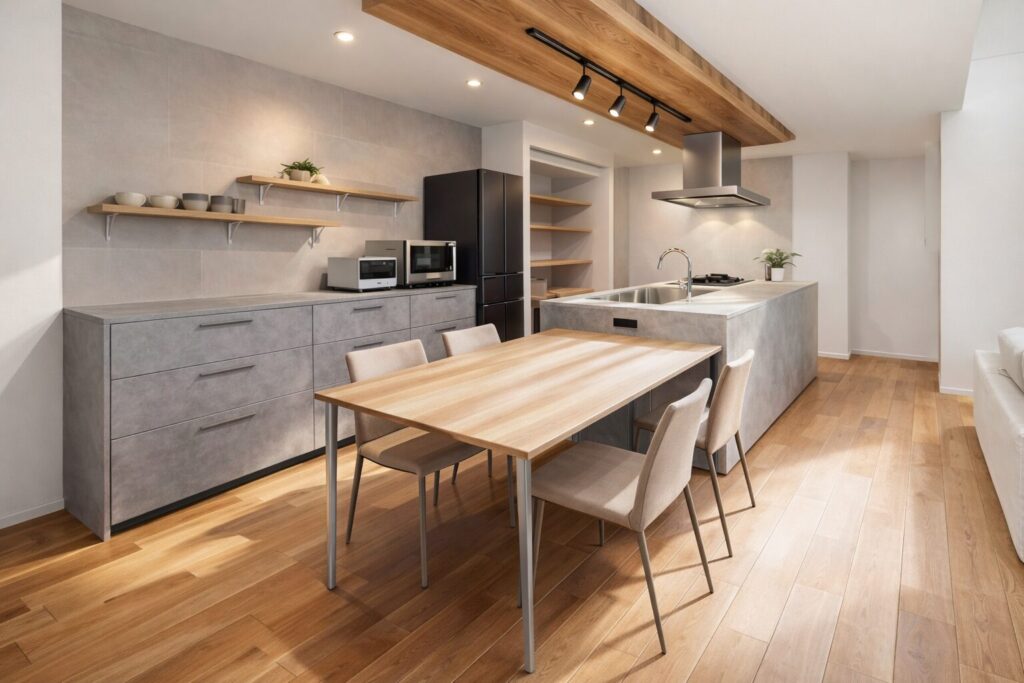 ダイニングキッチン上は折り下げ天井と間接照明が広がりを演出し、