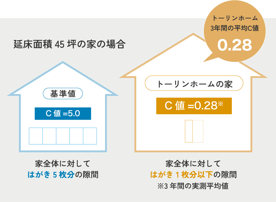 C値とは、「相当隙間面積」を表す値です。C値が低いということは、隙間が小さく、住宅の気密性が高いということを表しています。トーリンホームの3年間の平均C値は0.28!C値は施工の技術によっても左右されます。実際の数値は測定するまでわからないので、トーリンホームでは気密測定の実施をオススメしています。