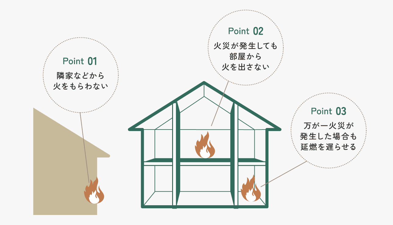 万が一火事が起きてしまったら、何より先にご家族の命を守らなければなりません。そのために、トーリンホームでは火災に強い住宅をご提案しています。ご家族も、周りの方の暮らしも守る、とても大切な性能です。