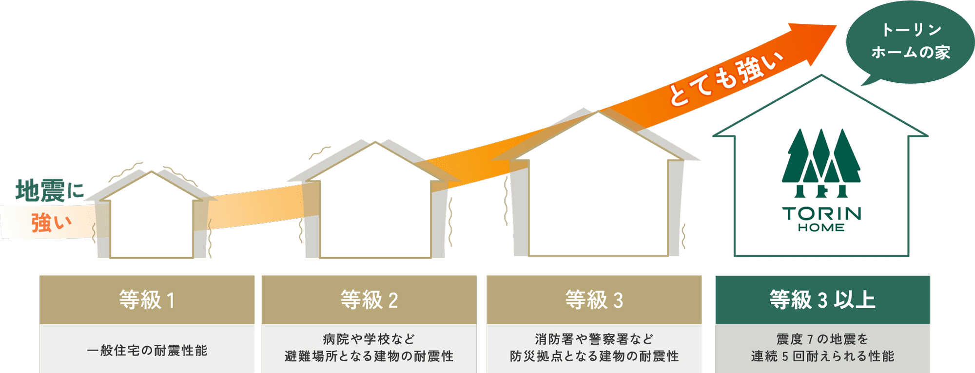 その結果、トーリンホームの建てる家は阪神大震災をはじめとする震度7クラスの地震にも、5回以上耐えることができる性能を実現。耐震等級3を取得するだけではなく、完成後の安心・安全を最優先に考え、基準を超える耐震性を追求し、ご提供しています。